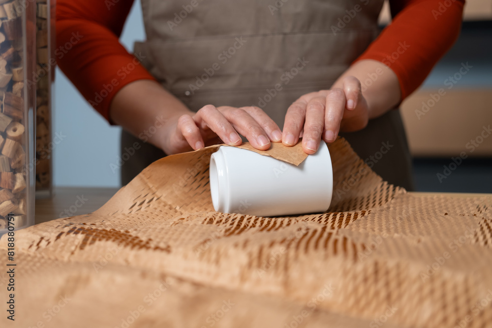 A woman places a "100% Recyclable Materials" label on a cardboard box filled with eco-friendly water hyacinth cushioning, demonstrating sustainable and environmentally friendly business practices