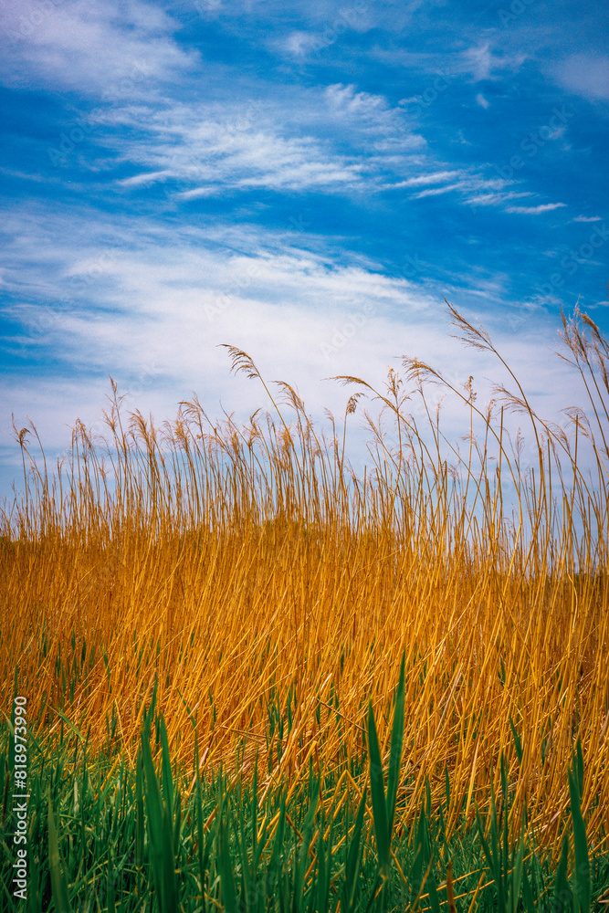 Dried common reed plant stems waving in the wind: Tranquil midwestern lakeshore summer landscape in Hartford, Minnehaha County, South Dakota