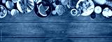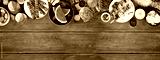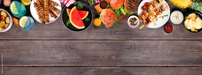 Summer BBQ food top border. Hamburgers, meat skewers, potatoes, fruit and snacks. Overhead view on a dark wood banner background. Copy space.
