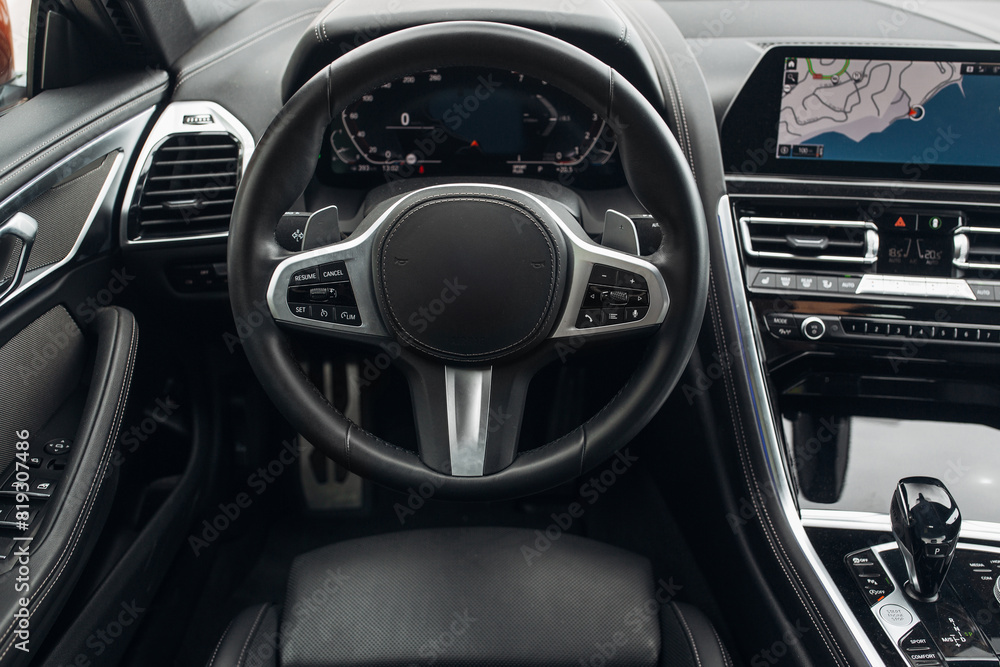 Modern expensive convertible car interior with leather panel, sport seats, multimedia and digital dashboard