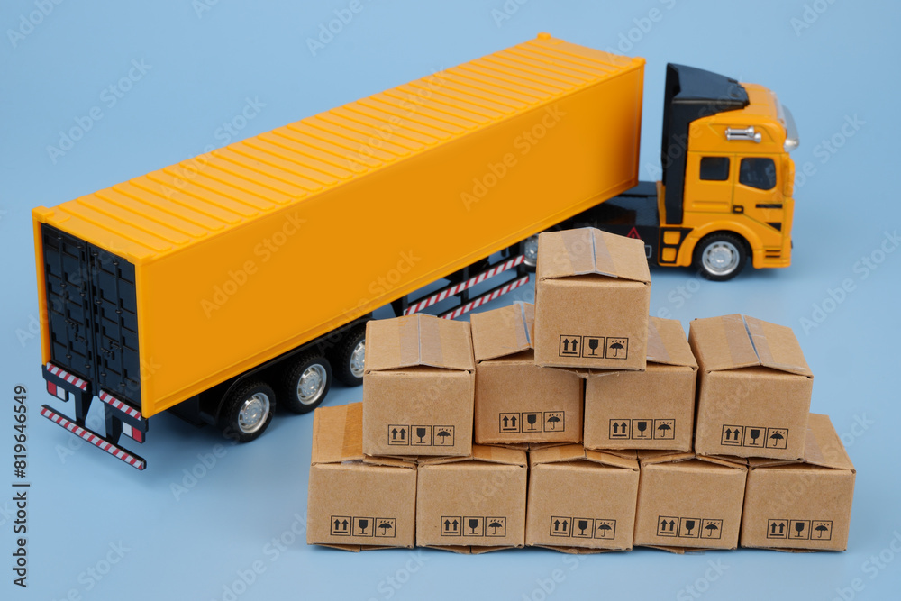 Cargo truck with carton boxes on blue background. Delivery concept.