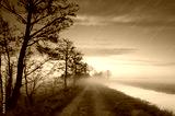 Empty countryroad during a foggy, spring sunrise.