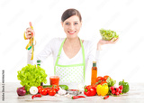 Happy woman with salad and measuring tape, healthy food and diet concept.