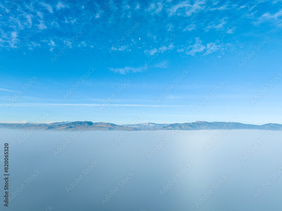 Front Range of Rocky Mountains in in Colorado with a fog blanket covering city of Fort Collins, winter morning aerial view
