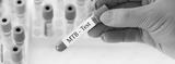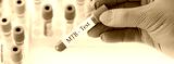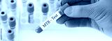Doctor holding a test blood sample tube with Mycobacterium tuberculosis (MTB) test on the background of medical test tubes with analyzes.