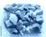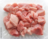 Raw pork meat. Fresh meat cubes. Diced pork in a plastic packaging.