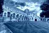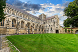 The stone arched buttresses and garden area along the south transept of the medieval Winchester Cathedral, in Winchester, Hampshire, England UK.