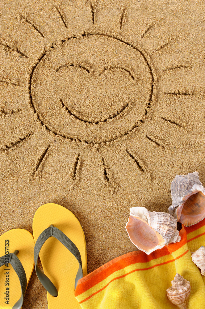 Smiling sun happy smiley face drawing drawn in sand on a tropical beach with seashells and accessories summer holiday vacation photo vertical