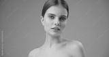 Beauty, health, cosmetics, anti-aging therapy and skin care concept - young beautiful brunette Caucasian woman touching face and looking at camera