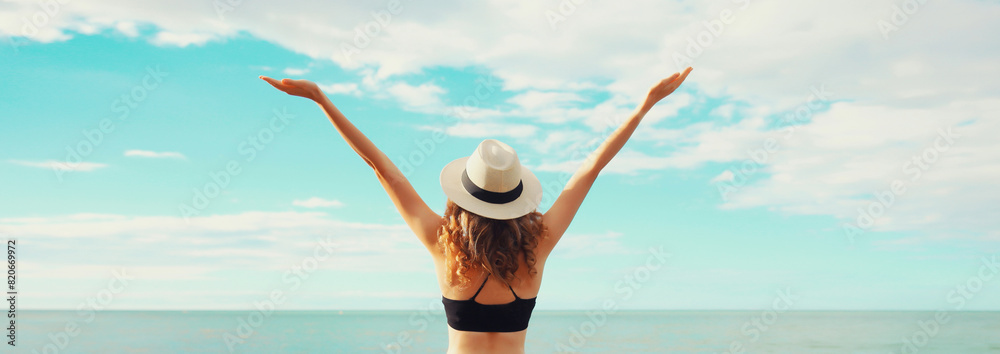 Summer vacation, beautiful happy woman in bikini swimsuit raising her hands up on the beach at sea