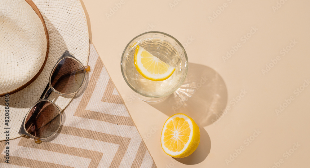 Summer layout with lemonade, fresh citrus fruits, hat and sunglasses on a beach towel on a beige background.