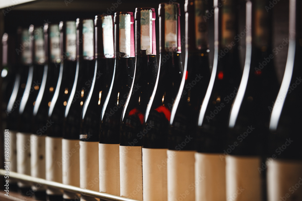 Row of Red Wine Bottles Lined Up on Wooden Shelves in Cozy Cellar