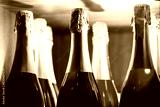 Close-Up of Sparkling Rose Wine Bottles on Wooden Shelf in Ambient Light