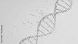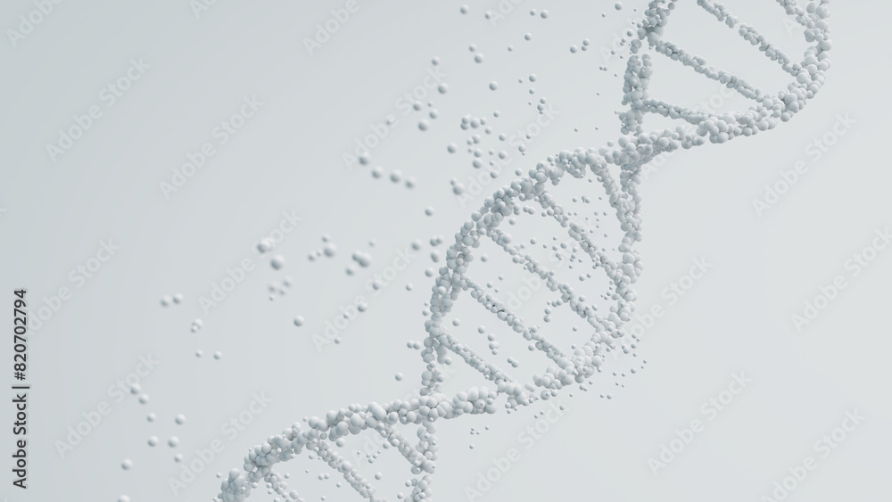 3D rendering of a DNA molecule in white with particles against a light background, scientific purity and genetic analysis.