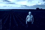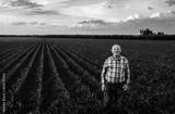 Portrait of senior farmer standing in corn field looking at camera at sunset.