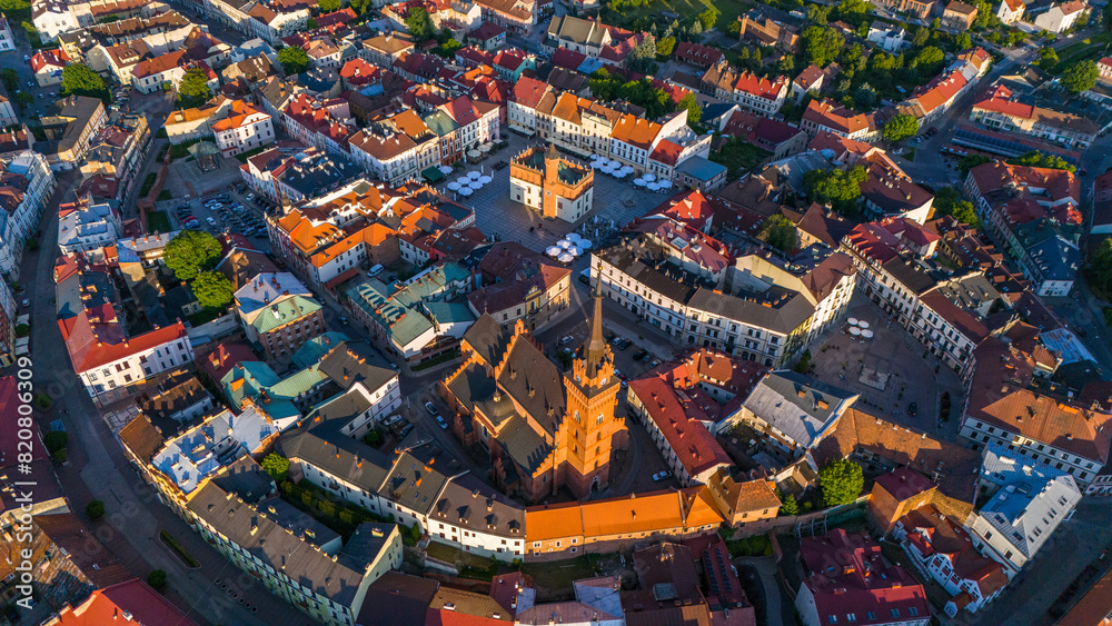 Picturesque cityscape of Old Town Cathedral and market square in Tarnow, Lesser Poland. Aerial drone view