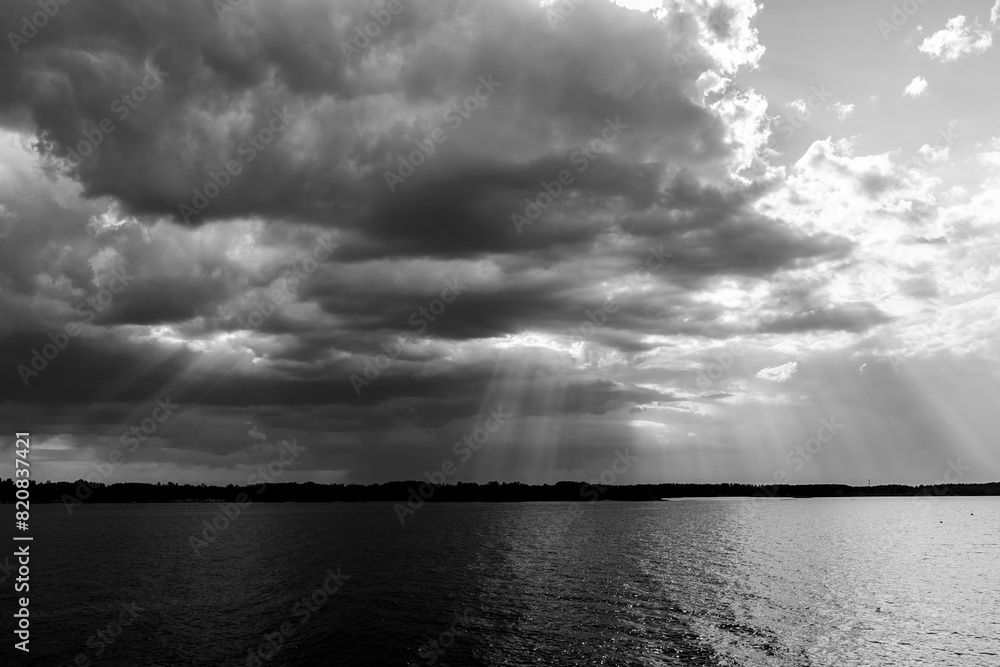 Black and white photos of dark storm clouds above river
