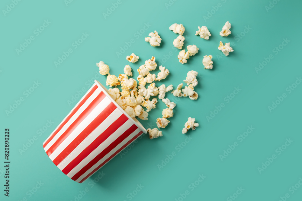Popcorn bucket, cinema snack cardboard box, theater treat striped pack,green background