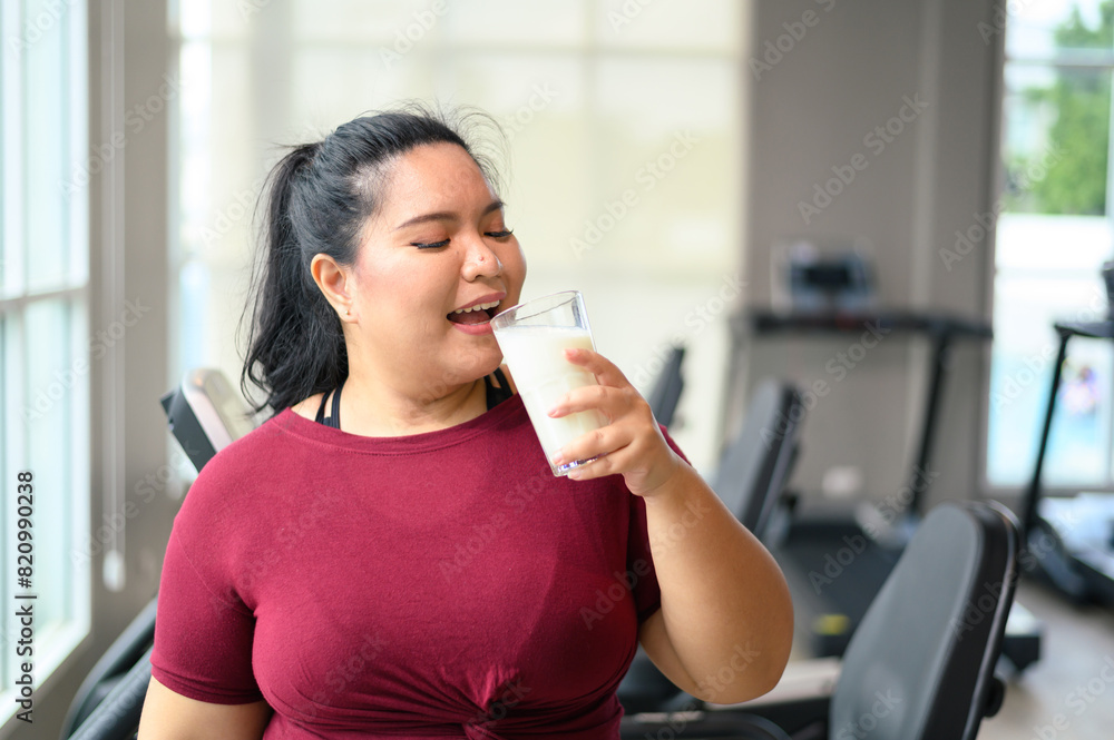 Overweight young woman drinking milk after fitness training workout. Weight loss workout, healthy lifestyle concept