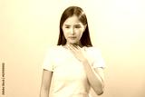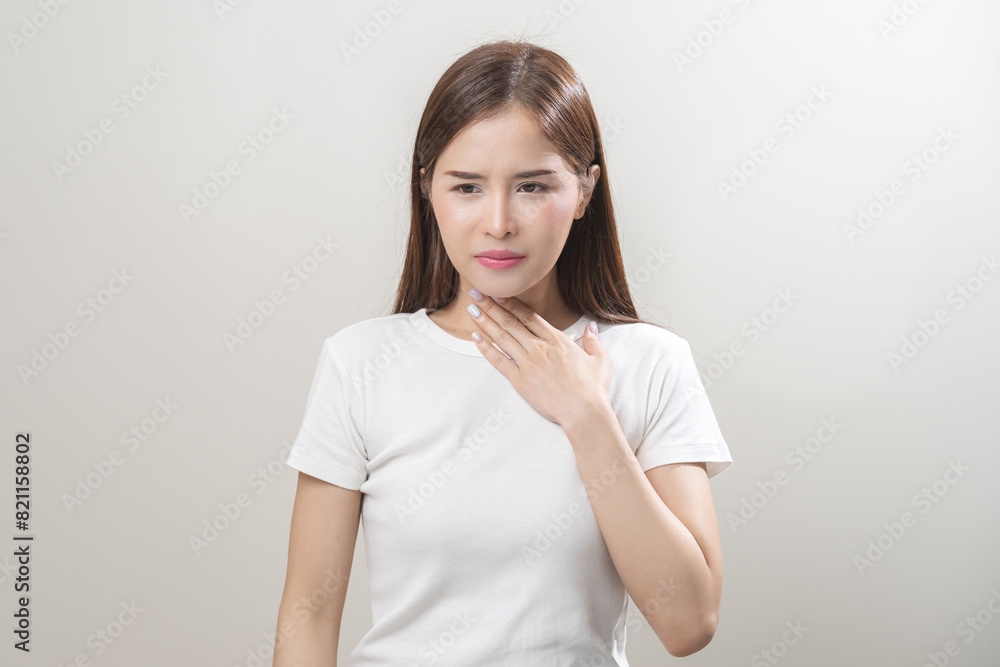 Sickness in inflaming asian young woman, girl use hand check self touch at sore throat, pain thyroid gland on neck or disease reflux, acid of suffer people on wall background. Medical and healthcare.