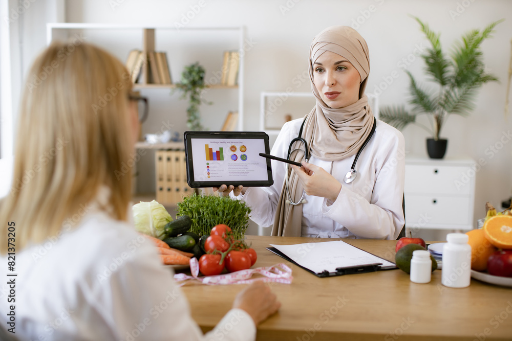 Mature lady patient visiting arabian woman nutritionist in hijab at modern clinic. Muslim female doctor showing on tablet graphs of food for healthy eating.