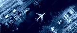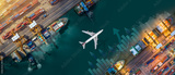 Aerial view and top view cargo plane flying above ship port in the export and import business and Smart logistics international goods. Shipping cargo to harbor by crane