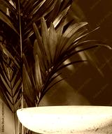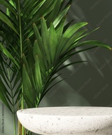 Round terrazzo white table podium, tropical palm tree in dappled sunlight on green wall for modern, luxury fashion, beauty, cosmetic, skincare, body care, product background 3D