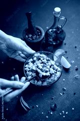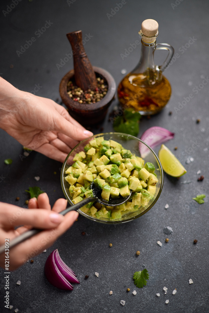 Woman mixing Chopped ingredients in a glass bowl - avocado, pepper and cooking olive oil