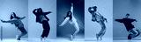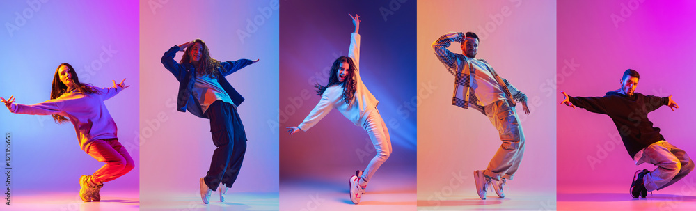 Dynamic collage. Talented people, professional dancers moving, dancing in action in neon light against gradient background. Concept of contemporary dance style, youth, hobby, action and motion. Ad