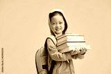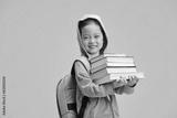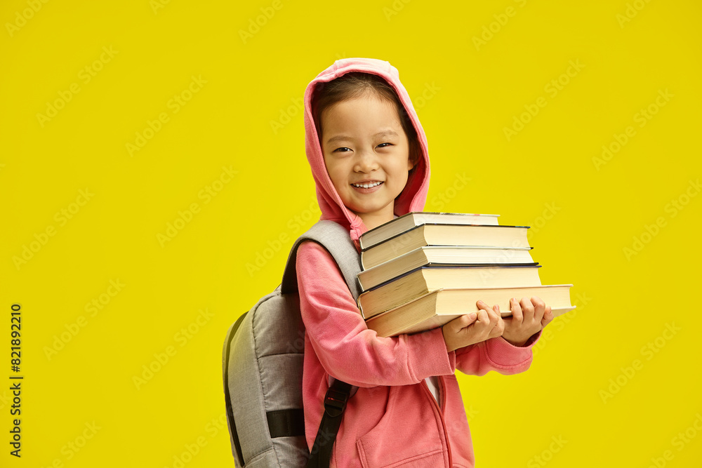 Active excellent little schoolgirl holding books going to school wears in hoodie and backpack on shoulders, isolated on yellow background. Go to school