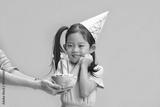 Mood of Holiday. Thoughtful Child Girl in Party Paper Hat Gazes at Birthday Candles on a Cake, Ready to Make Wish and Ready to Blow them out having in Anticipation Staning on Sunny Yellow Background.
