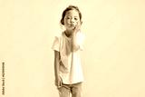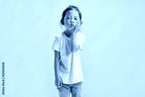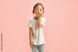 Little child girl with a bored expression, tired puts hand on cheek, having upset from fatigue, wearing in casual white t shirt and jeans, sadness and sleepy looking to camera on pink isolated wall.