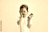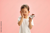 Consequences of excessive sugar consumption for children. Unhappy child touching herself cheek by dental pain standing on pink isolated background. Kid suffers from caries.