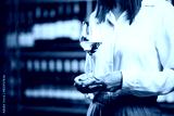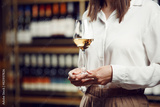 Close up woman hold glass with poured white wine on cellar background with a free copy space.