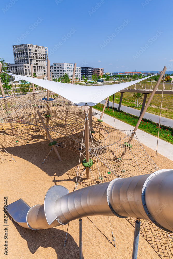 Large public city playground, panorama of modern urban area
