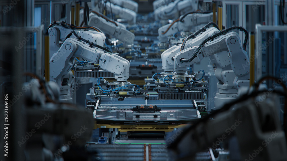 Row of White Robotic Arms at Automated Production Line at Factory. Electric Car Manufacturing Line Inside Automotive Smart Factory. Industrial Robot Arms Assemble Lithium-Ion EV Battery Pack.