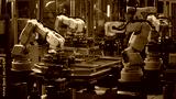 Electric Car Battery Manufacturing Line. Industrial Robot Arms Assemble Lithium-Ion EV Battery Pack Inside Automotive Smart Factory. White Robotic Arms at Automated Production Line