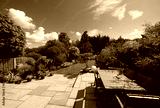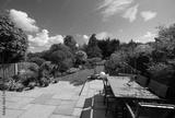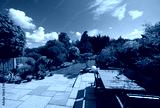 Beautiful summer garden in England, UK with lawn, table and chairs and large indian sandstone patio.