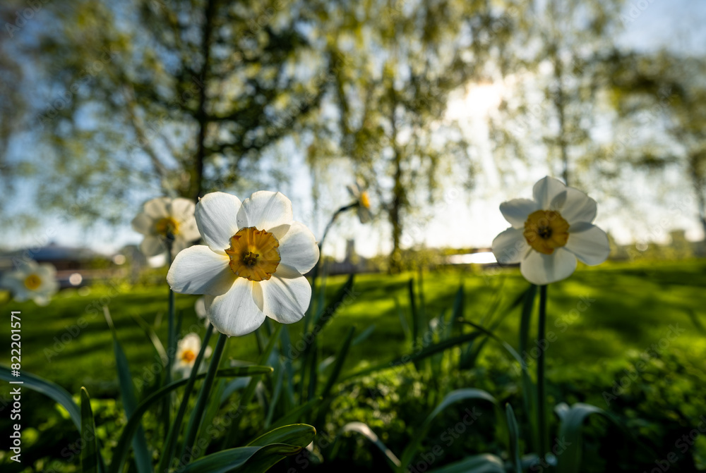 Narcissus flowers on the street in close-up.