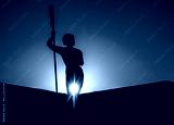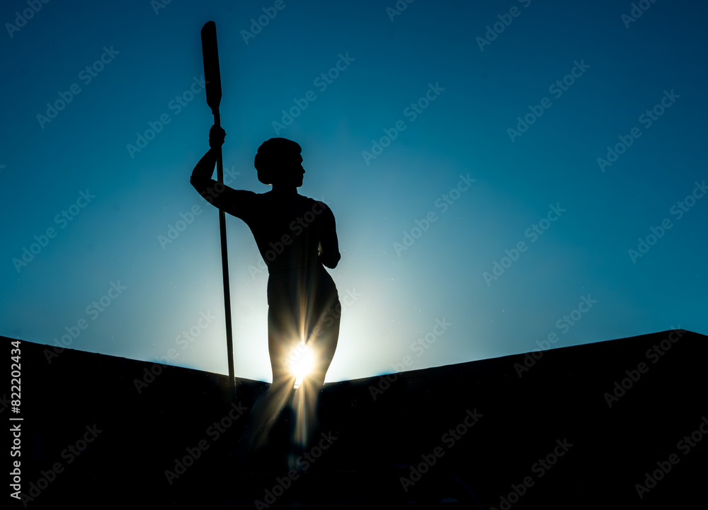 Silhouette of a statue of an athlete against the sky.