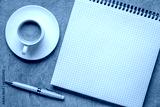 blank spiral notebook with grid paper, flat lay with coffee on textured art paper