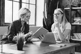 Loving young caucasian female lgbtq couple lesbians reading books, studying together at home office, doing homework, doing paperwork, preparing for college university