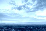 Bird's eye view of the sunset. Below are fields and villages against a dramatic, beautiful sky.
