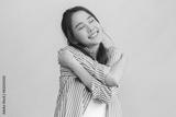 Smiling positive, hug self care happy asian young woman hands hugging herself shoulders, enjoy yourself, self love and self care, smile girl face expression self esteem standing isolated on background
