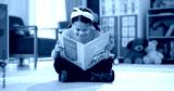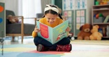 Girl, school and reading book in classroom, childhood development and growth for vocabulary in kindergarten. Happy, smile and knowledge or information with storybook, learning and fantasy for child