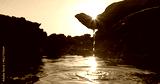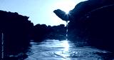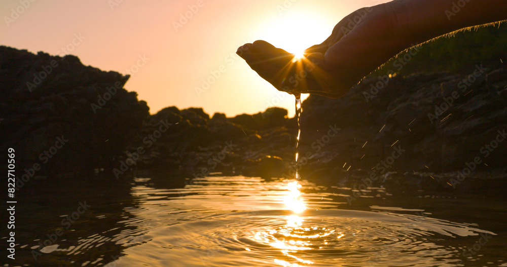 CLOSE UP, LENS FLARE: Sunbeams peep through a hand scooping water in sea puddle formed at low tide on rocky shore. Crystal clear water sparkles as the golden rays of setting summer sun shine through.
