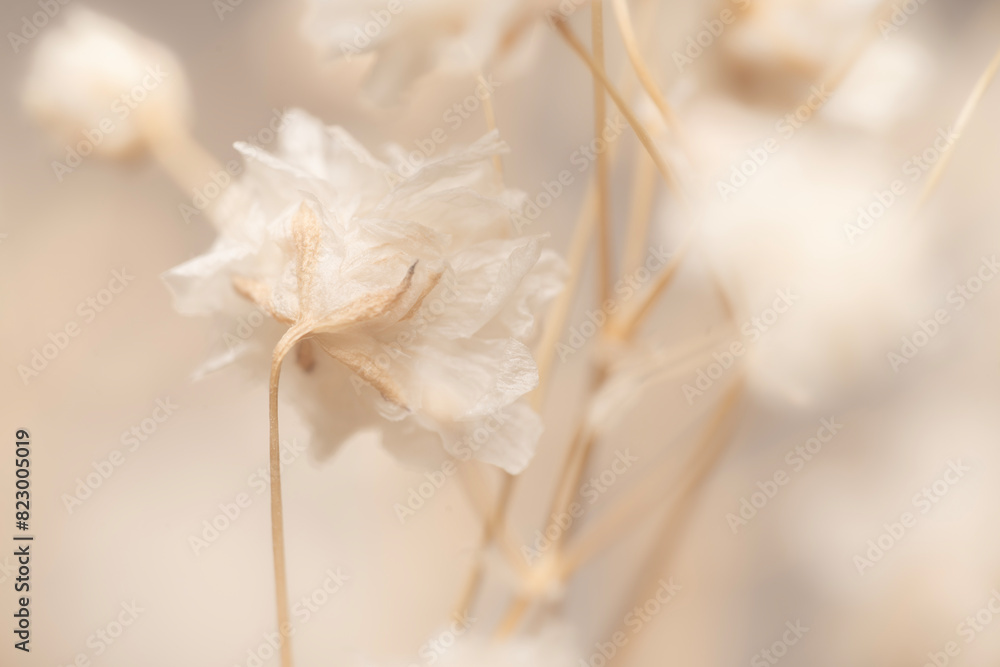 Dry light small white gypsophila romantic flower from the back macro with blur background