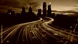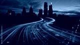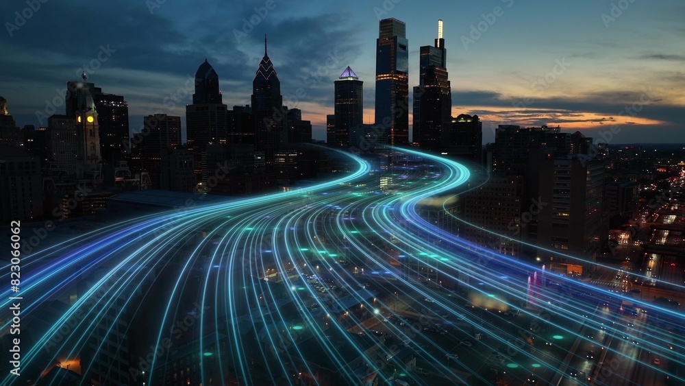 Smart city digital transformation development concept. Band lights over modern urban cityscape at night. New fast internet communication 5G technology. Fiber Optics