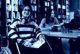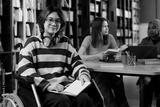 Red-haired Asian girl with disability sitting in wheelchair in modern college library looking at camera