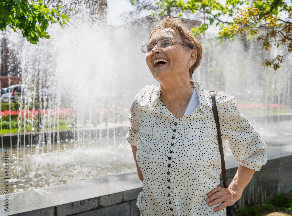 Senior happy attractive woman enjoying fresh air in the park near the fountain